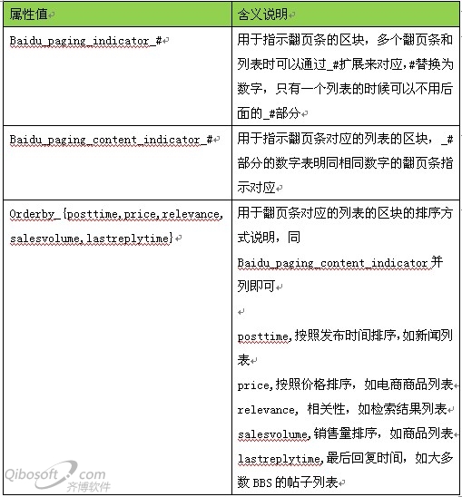 对翻页条对应的区块元素p可以设置class属性Baidu_paging_indicator,对该翻页条对应的主体链接的区块元素div,设置 Baidu_paging_content_indicator Orderby_posttime,这样翻页条和对应的链接区块就对应起来,并且告知了百度是按照发布时间排序的,从而可以优化spider系统的抓取行 为,改善站点的收录效果。