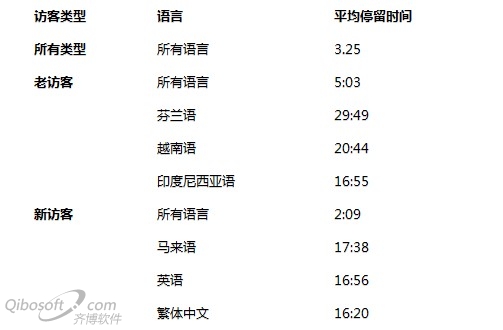在这种情况下,你可以判断新访客或老游客哪个停留的时间更长,通过增加的语言维度,你还可以看到在新旧访客中操哪一种语言的新访客或是老访客在网站上的停留时间最长。