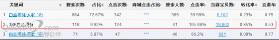 由图上可以看出宝贝类目是黄金/黄金,搜索18k白金项链总搜索量是117,宝贝类目是项链时,搜索18k白金项链总搜索量是1。