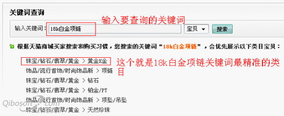类似于18k白金项链,这样的关键词,淘宝的新手会误为,精准类目就是项链。如果卖18k白金项链的店主,将宝贝归类到项链,当顾客搜索18k白金项链这个关键词时,排名会比较靠后。因为淘宝搜索引擎,默认这个关键词对应的最精准类目就是黄金k金这个类目。放到其他的类目,宝贝就不会优先展示。
