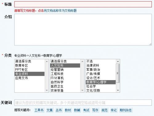 3、文档信息的填写在上传文库的时候需要填写文档信息,可以用简短的话介绍下文库的内容、关键词处填上长尾词,还有要正确的选好分类,如下图: