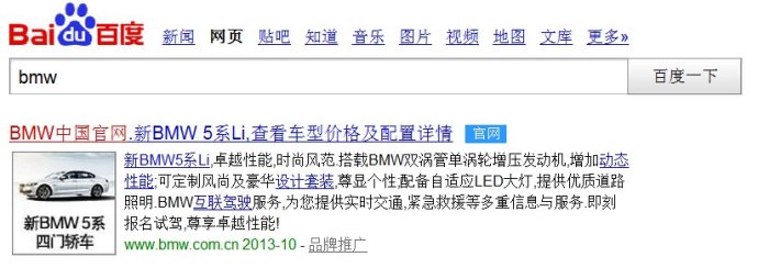 2. 域名可以和网站主题或网站名称相呼应,让人看到域名就能知道网站内容。比如宝马的域名BMW,大家都知道这就是宝马的主题标志,或者直接说别摸我,这样的域名非常好,和企业主题相呼应。甚至有大量的人直接用BMW来搜索宝马相关信息,如图: