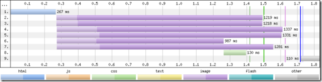 下面这个瀑布流是使用IE8打开链接中网页的结果,性能有显著的提升:IE8=7S > IE7=14S。