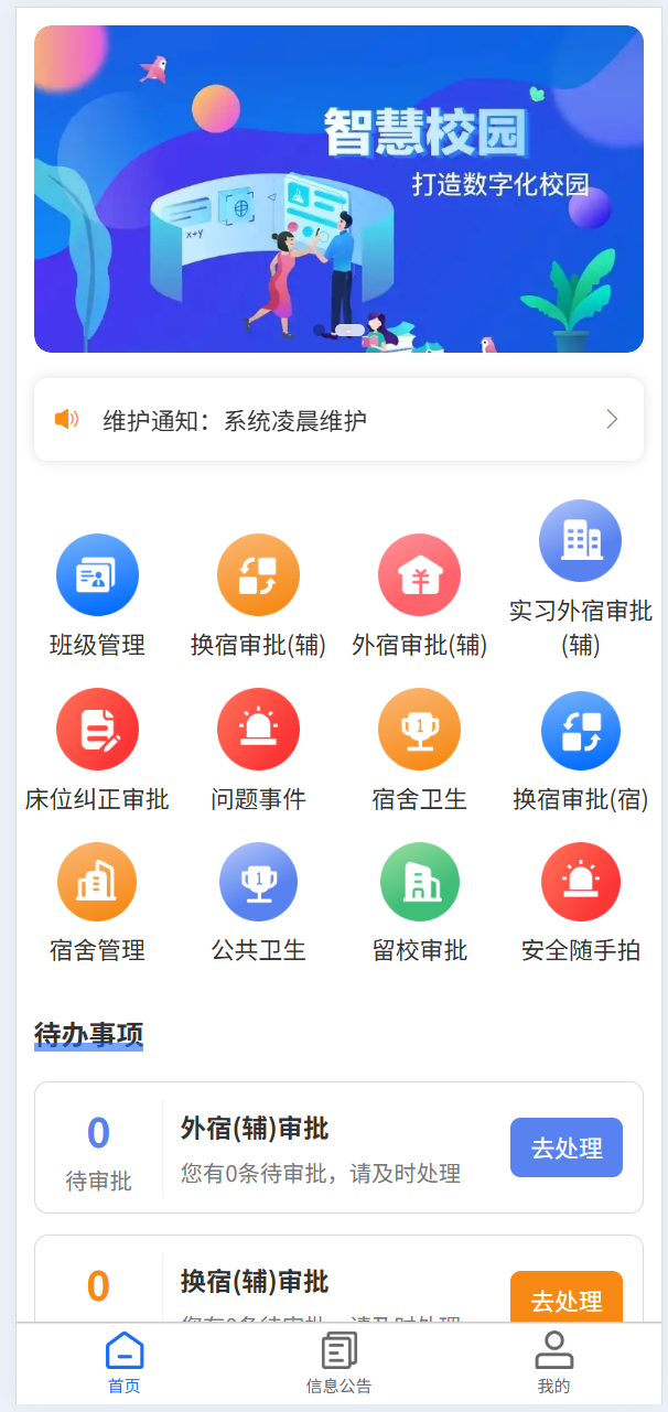 考勤与查寝:自动归寝考勤、未归 / 晚归统计、夜间查寝电子化、异常通知辅导员。